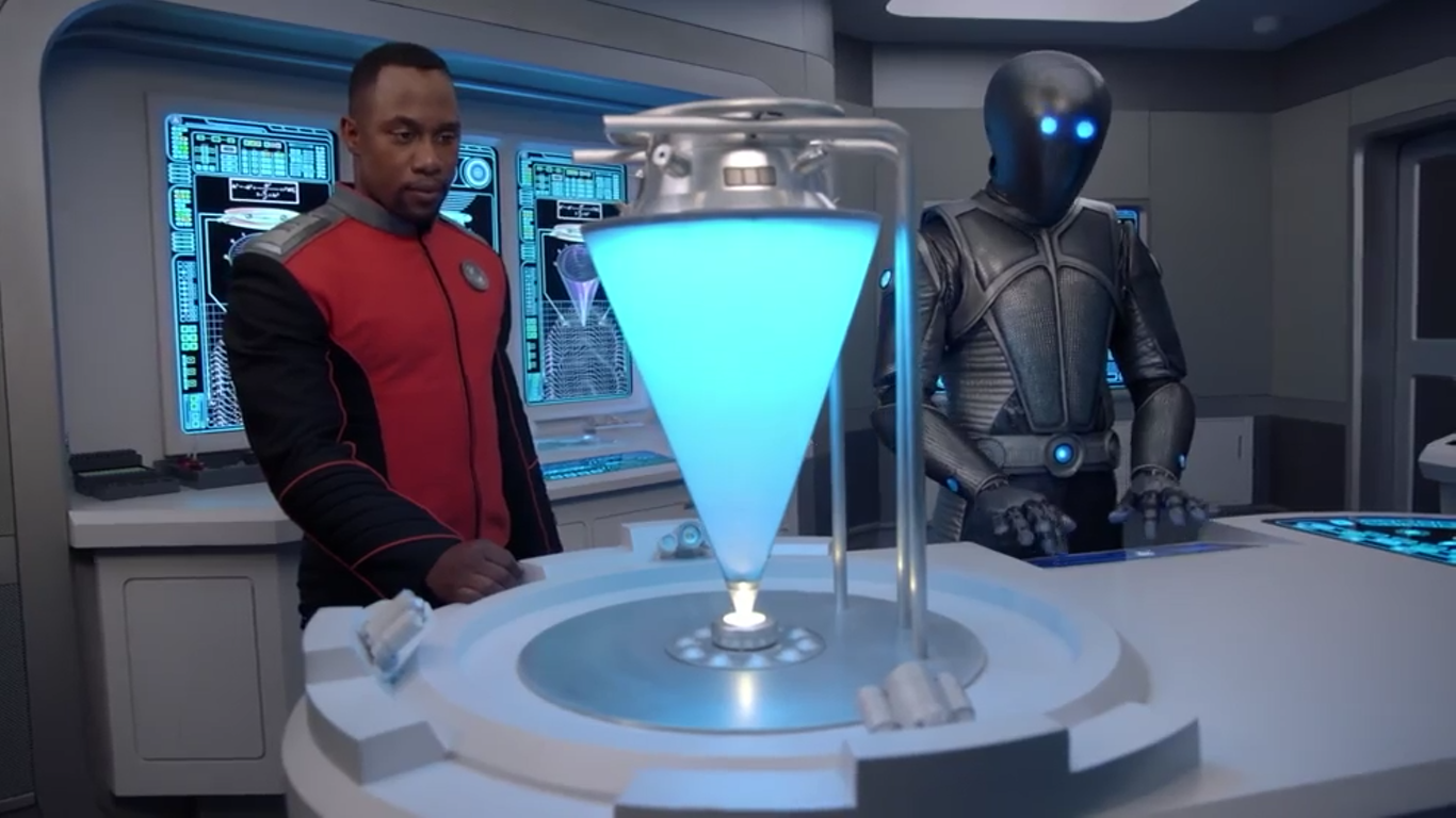 The Cone has a long history on the show, as we've seen it at least twice before. It first popped up way back in the very first episode, Old Wounds. If you'll recall, Dr. Aranov conned the Orville into visiting his research station on Epsilon II, in order to protect his "temporal field device" from the Krill. Mercer noted that with this new piece of technology, "We need no longer fear the banana."